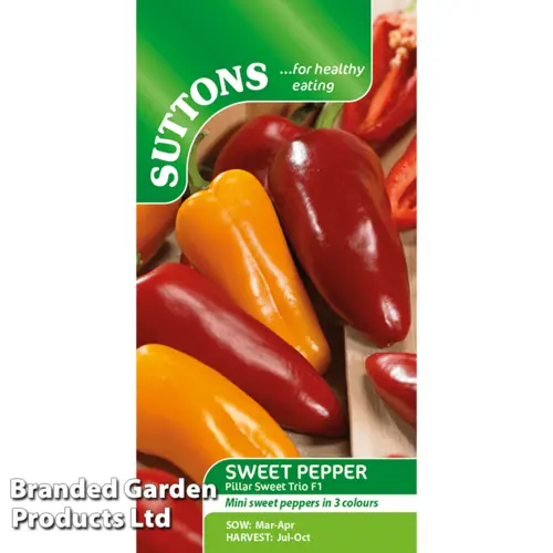 A revolutionary variety that produces its fruits from its central stem, meaning the plants won't bend or fall, or get damaged by curtains or blinds if grown on a windowsill. Sweet Pepper ‘Pillar Sweet Trio' bears single-serving-sized tasty sweet, mini peppers in orange, yellow and red with a thick crunchy flesh. Grow on a windowsill, sunny patio or in a greenhouse and enjoy added to salads and stir-fries or simply just for snacking on! Height 40cm (16in). Spread: 30cm (12in).