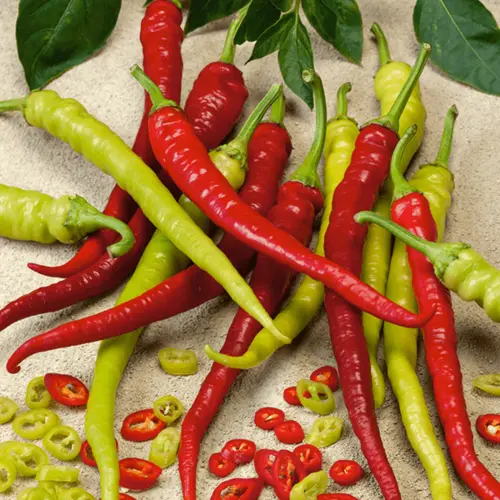 An early variety with long ram's horn fruits that have an average length of 20-25cm. The fruits start a very pale green and gradually turn red. Healthy and high-yielding, use fresh in salads or roasted in the oven. It’s also great for pickling whole as the flesh stays crunchy after processing. This reasonably tall variety may require support as the fruit begin to ripen.
