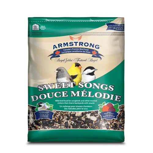 Premium blend designed specifically with Songbirds in mind! Formulated with 15% sunflower chips, Sweet Songs is the ultimate songbird food. Best used with a large port tube feeder or hopper feeder. Sweet Songs is made only with ingredients that beautiful Songbirds love: •Black Oil Sunflower – one of the most high energy and popular seeds for Songbirds •White & Red Millet – desired grains for small Songbirds and ground feeding birds •Sunflower Kernel Chips – all of the high energy benefits of sunflower without the shells and waste – great for small Songbirds •Nyjer – one of the most popular seeds for many small Songbirds •Safflower – desired seed for Songbirds (and not a desired seed for nuisance birds or squirrels/chipmunks) •Peanuts – one of the most high energy and popular seeds for several Songbirds Attracts: American Goldfinches, Black-capped Chickadees, Dark-eyed Juncos, Purple Finches, House Finches, Common Redpolls, Pine Siskins, House Sparrows, Rose-breasted Grosbeaks