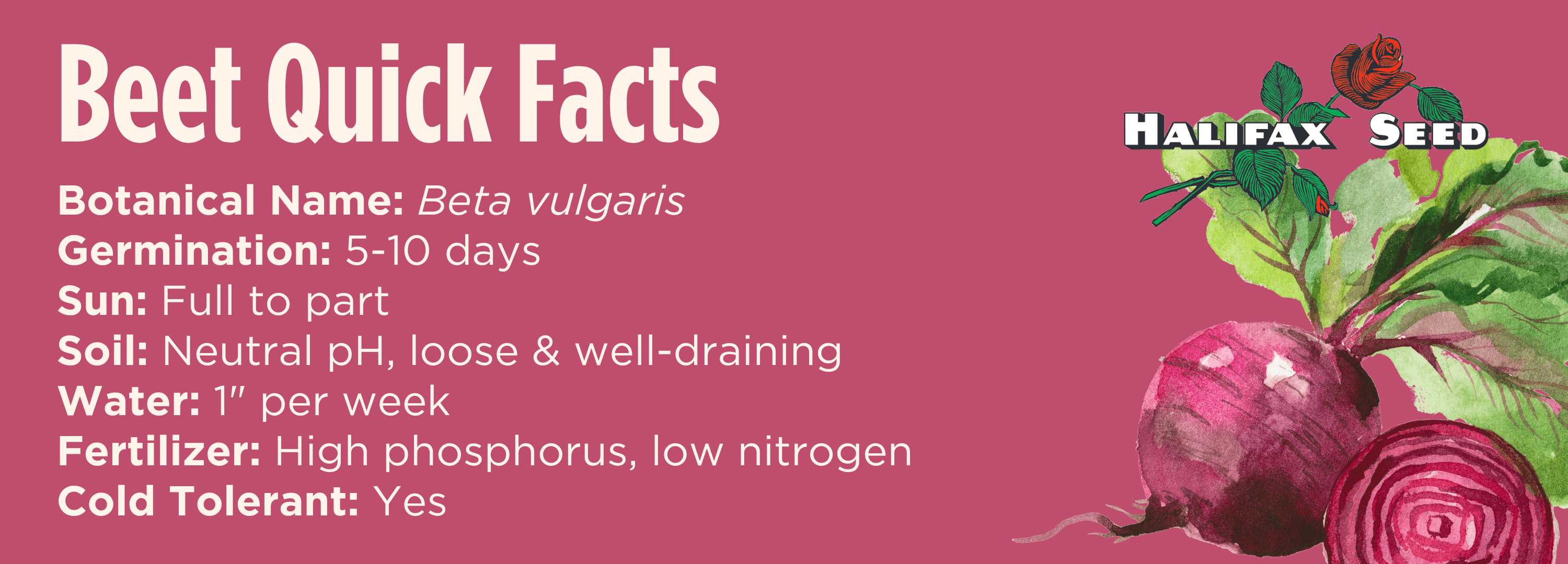 Beets can be planted as soon as the soil is workable in the spring. Waiting until the soil has warmed to 10°C will speed germination time, which typically takes 5-10 days. Beets are slightly more tolerant of disturbance to their roots than most other root vegetables and can be transplanted when young, but we recommend direct sowing in the garden when possible. Sow your seeds in rows ½” deep and space plants 1-2" apart. Seeds can be soaked prior to planting to improve germination rates. Beets need to be thinned once plants reach 4-5" tall to maintain proper spacing. For successional harvests, plant beets every 2-3 weeks. Avoid planting during hot, dry spells in the summer.