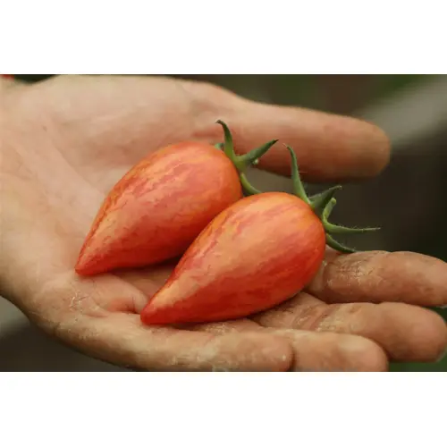 Both visually and gastronomically stunning. Sweet and flavourful saladette, with pink and golden-orange striping. Plump, tapering to a pointy end. 25 seeds