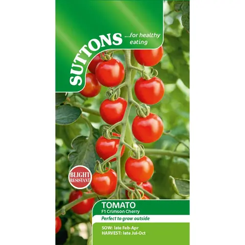 The Crimson Cherry is the first blight-resistant cherry sized tomato, making it the perfect variety to be grown outside in the UK. This remarkable tomato variety is ideal for small pots, baskets, or any containers, reaching heights of 151-200cm (59-79"); spread 41-50cm (16-20"). Extremely versatile, this tomato plant shows good resistance to Fusarium, Verticillium, and both early and late blight! Crimson Cherry tomatoes are deliciously sweet (9 Brix). Its fruits have a satisfying 'tang' which makes you want more. These tomato plants will keep cropping until the first frosts outside and longer if grown in a greenhouse or tunnel. Growing your own tomatoes is a great place to start, they are simple to grow and a few tomato plants can reward you with a plentiful supply of delicious fruits. Tomatoes come in all shapes and sizes, the vast choice of tomatoes available means you're spoilt for choice!