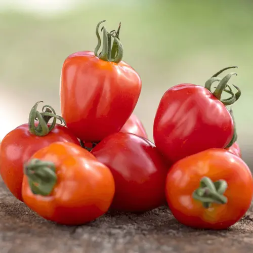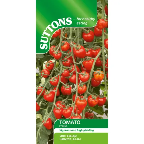 Glossy, deep-red strawberry-shaped fruit that are inviting you to eat them! Tomato 'Fraise' is a vigorous and high-yielding variety with an abundance of long cascading tresses. Each cluster cradles an average of 16 juicy, soft-skinned fruits with a firm texture and delectable sweet flavour, rating 8 to 10 on the Brix scale. Perfect for lunch boxes - children will love these heart-like fruits. Height: 200cm (79in). Spread: 50cm (20in).