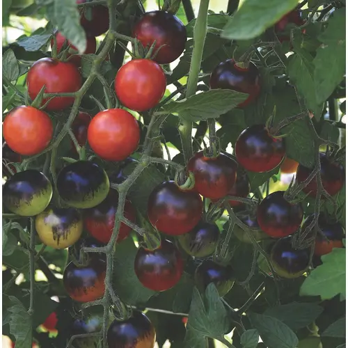 This All American Selections Winner is a unique cherry tomato that ripens red with an overlay of glossy black-purple on the skin with exposed to sunlight. Productive all season, 1.5" sized fruits are well-balanced and flavourful. Great in salads or eaten straight off the vine. An All-American Selection (AAS) award winning variety.
