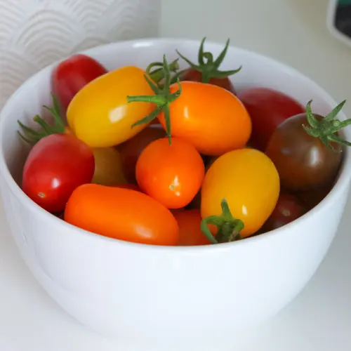 Mingle Mix is a mix of grape tomatoes in candy-hued colour for the home garden. The mix includes gold, red, yellow and chocolate fruit. The plants are high yielding and set continuously throughout the season. The fruits are sweet but crack resistant and all weigh about one ounce. Each plant produces one colour of fruit. We suggest gardeners grow six plants or more for the best colour range. 12 seeds per package. 65-70 days.