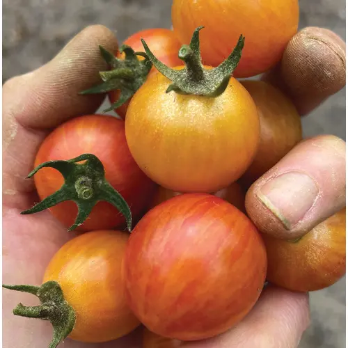 70 Days. Sweet flavor picked right from the vine. Golden-yellow with red stripes cherry tomatoes have a beautiful pink interior marbling and produce all summer long. Resistant to cracking, Sure to be a new garden favourite! 18 Seeds.