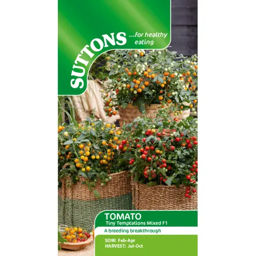 A tiny tomato with a big flavour! A Fleuroselect Gold Medal winner, Tomato ‘Tiny Temptations’ produces a constant supply of super-sweet cherry tomatoes. The brightly coloured fruits come in red, yellow and orange and remain on the plant for a long time without easily dropping or bursting. A basket-type, trailing tomato, ‘Tiny Temptations’ produces a cascade of colourful fruits that both look and taste fabulous. Grow this space-saving variety in any type of container close to the back door where you can easily snack upon its sweet fruits straight from the vine. Easy to grow and highly tolerant to both blight and mildew. Height: 40cm (16in). Spread: 15-20cm (6-8cm).