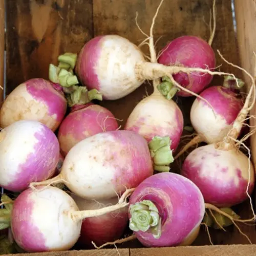 A popular summer turnip, this outstanding variety boasts smooth globe-shaped roots with purple shoulders are a creamy white bottom. The quick-growing roots rae best picked when they are between 5-13cm (2-5") in diameter and have a mild, crisp. pure white flesh. An excellent variety for the home or market.