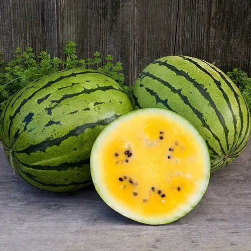 Productive, early icebox melon with dark green stripes and crisp bright yellow flesh. Uniform fruits with sweet flavor topped our taste tests. Harvest promptly as fruit has a tendency to split when ripe in the field. Excellent variety for direct markets or shipping. Ships well Uniform 10-15 lbs Hybrid