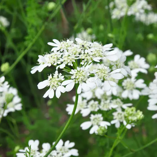 Flat umbels of lacy white flowers which seem to float over borders, composed of small inner and large outer florets that form a pretty pattern reminiscent of hydrangeas. Planted en masse, the luminous white petals have a shimmering effect, creating a soft haze with a romantic cottage garden vibe. Long straight stems and soft ferny foliage add to its appeal. Height: 75cm (30"). Spread: 50cm (20").