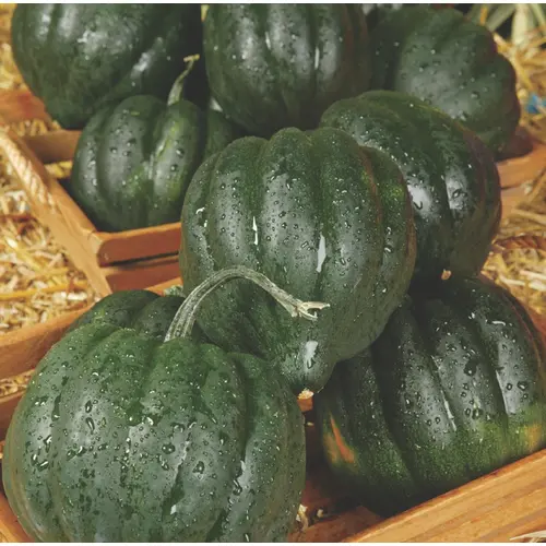 The traditional acorn squash bears a generous harvest of dark green, grooved acorn-shaped fruits that meassure approximately 13x10cm (4x5"). The medium thick flesh is pale orange, dry and sweet with a wonderfully distinct flavour.